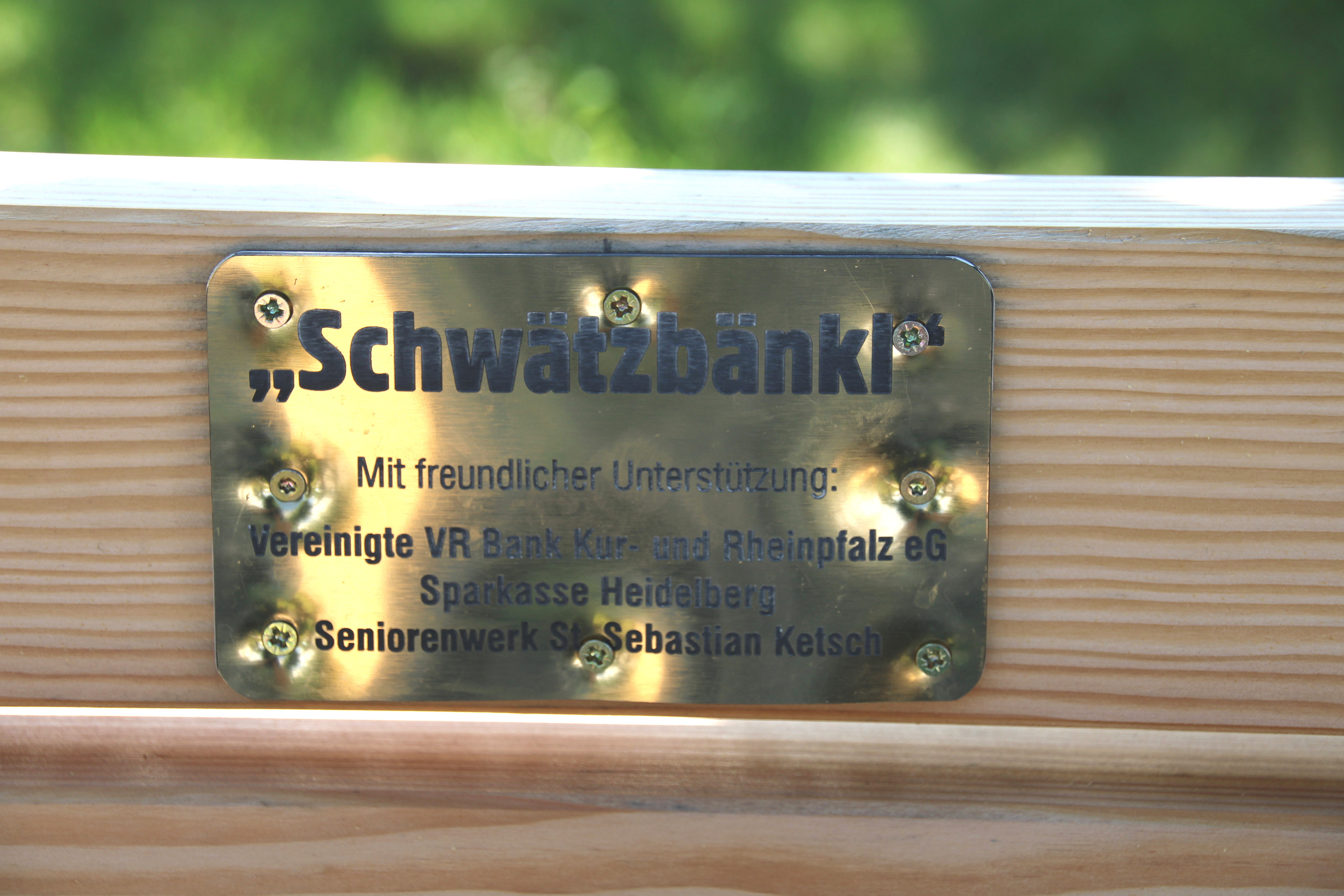Sich treffen - ob zufällig oder nicht, sich hinsetzen und miteinander reden: Hierzu lädt das „Schwätzbänkl“ auf dem Marktplatz ein. Für diese dauerhafte Aktion, organisiert vom Seniorenbüro in Zusammenarbeit mit dem Seniorenbeirat, wurden zwei gegenüber stehende Bänke aufgestellt und jeweils mit einem Schild „Schwätzbänkl“ versehen. Finanziell unterstützt wurde das Projekt von der Sparkasse Heidelberg, von der Vereinigten VR Bank Kur- und Rheinpfalz eG sowie vom örtlichen Seniorenwerk Sankt Sebastian.