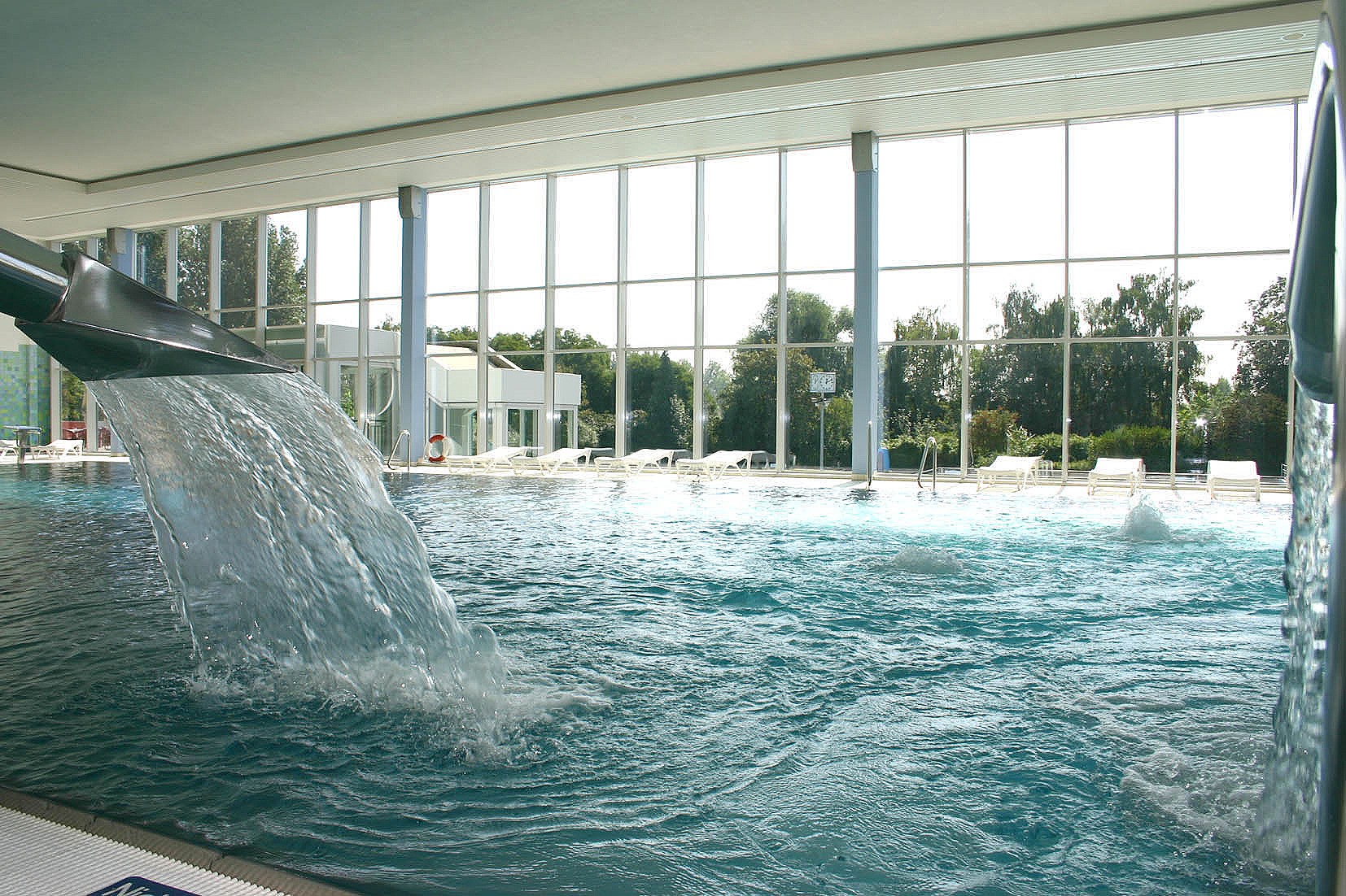 Im Hallenbad erwartet die Besucher ein sportgerechtes Mehrzweckbecken von 12,5 auf 25 Meter. Die Wassertiefe beträgt zwischen 0,90 und 3,65 Meter. Im Becken gibt es vier Wassermassagedüsen sowie eine Unterwasserbeleuchtung. Des Weiteren ist das Hallenbad mit zwei Wärmelampen und Ruheliegen ausgestattet.