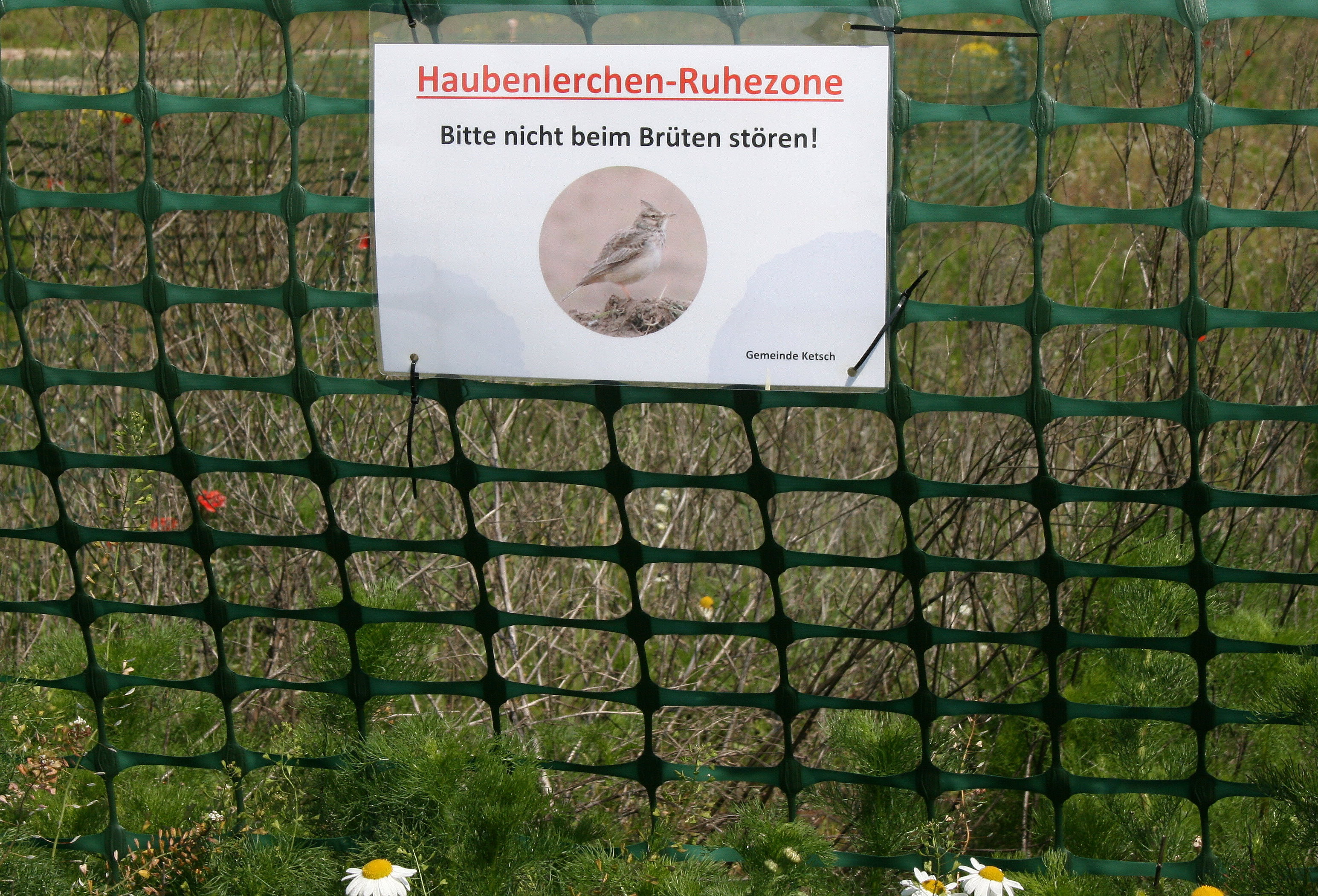 Von großer Bedeutung ist somit auch das Vorkommen der Haubenlerche in Ketsch. Mit der Umsetzung des Bebauungsplanes „Gewerbegebiet Süd, 4. Änderung“ galt es zu handeln: Zwischen der Gemeinde Ketsch und dem Vorhabenträger sowie der projektentwickelnden Firma und dem Land Baden-Württemberg wurde ein Vertrag geschlossen. Hierbei übernimmt die Gemeinde Ketsch die Trägerschaft für die Durchführung der Artenschutzmaßnahmen. Die Kosten trägt zu einem überwiegenden Teil die projektentwickelnde Firma. Das Land Baden-Württemberg stellt die für die Maßnahmen erforderlichen Grundstücke zur Verfügung.