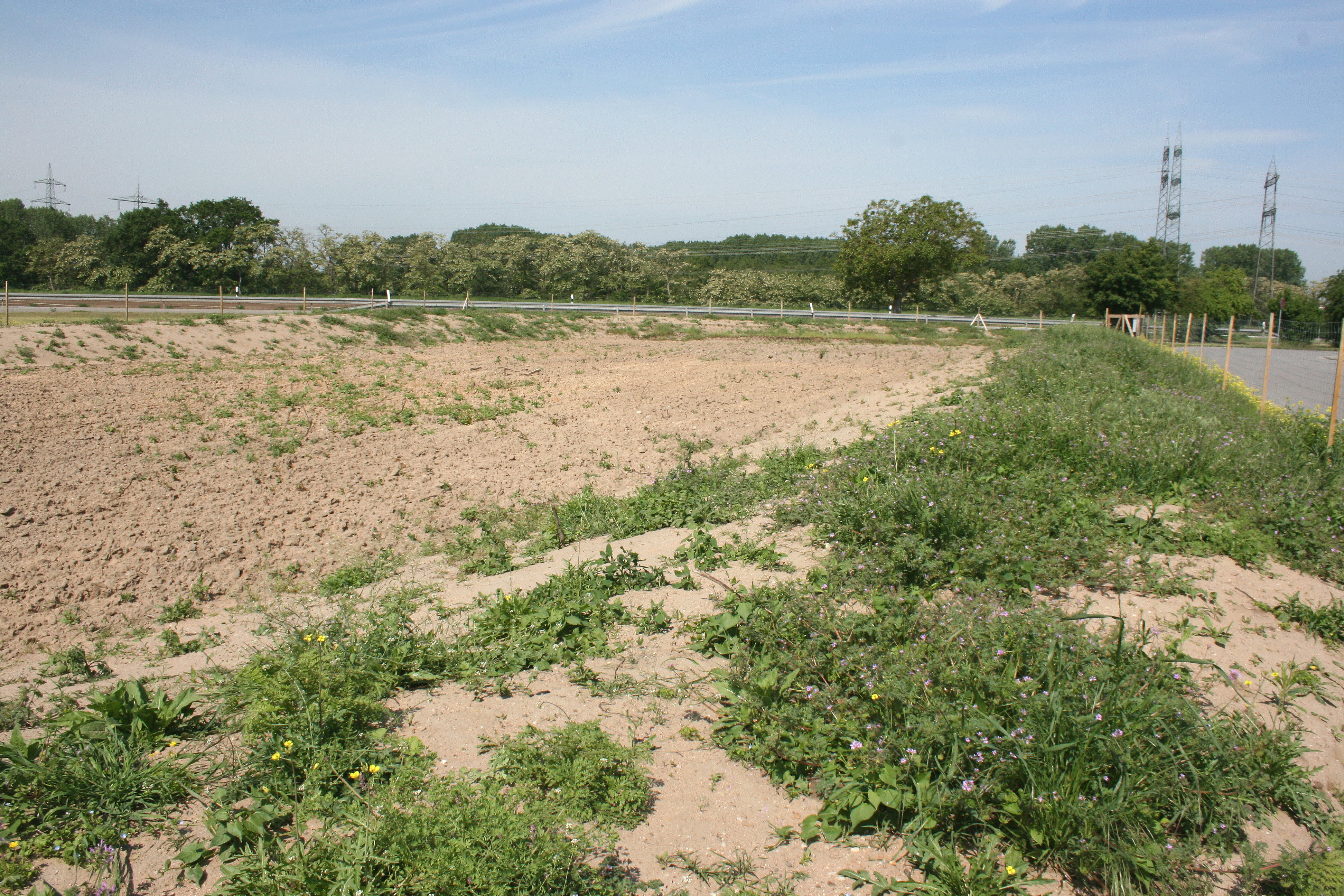 Im Zuge besagter Artenschutzmaßnahmen wurden im Gewerbegebiet Süd zwei Habitatflächen für die Haubenlerche ausgewiesen und eingezäunt. Dort wurden unbepflanzte Spargeldämme angelegt - die sandigen Böden sind ein bevorzugter Lebensraum für die Haubenlerche - und mehrere strohreiche Pferdemisthaufen gesetzt, die allerlei Insekten anziehen und somit das Nahrungsangebot für die Haubenlerche steigern. Vor allem während der Jungenaufzucht benötigen die Vögel, die ihren Namen der spitzen Federhaube auf ihrem Kopf verdanken, viele Insekten, Spinnen und Würmer.
