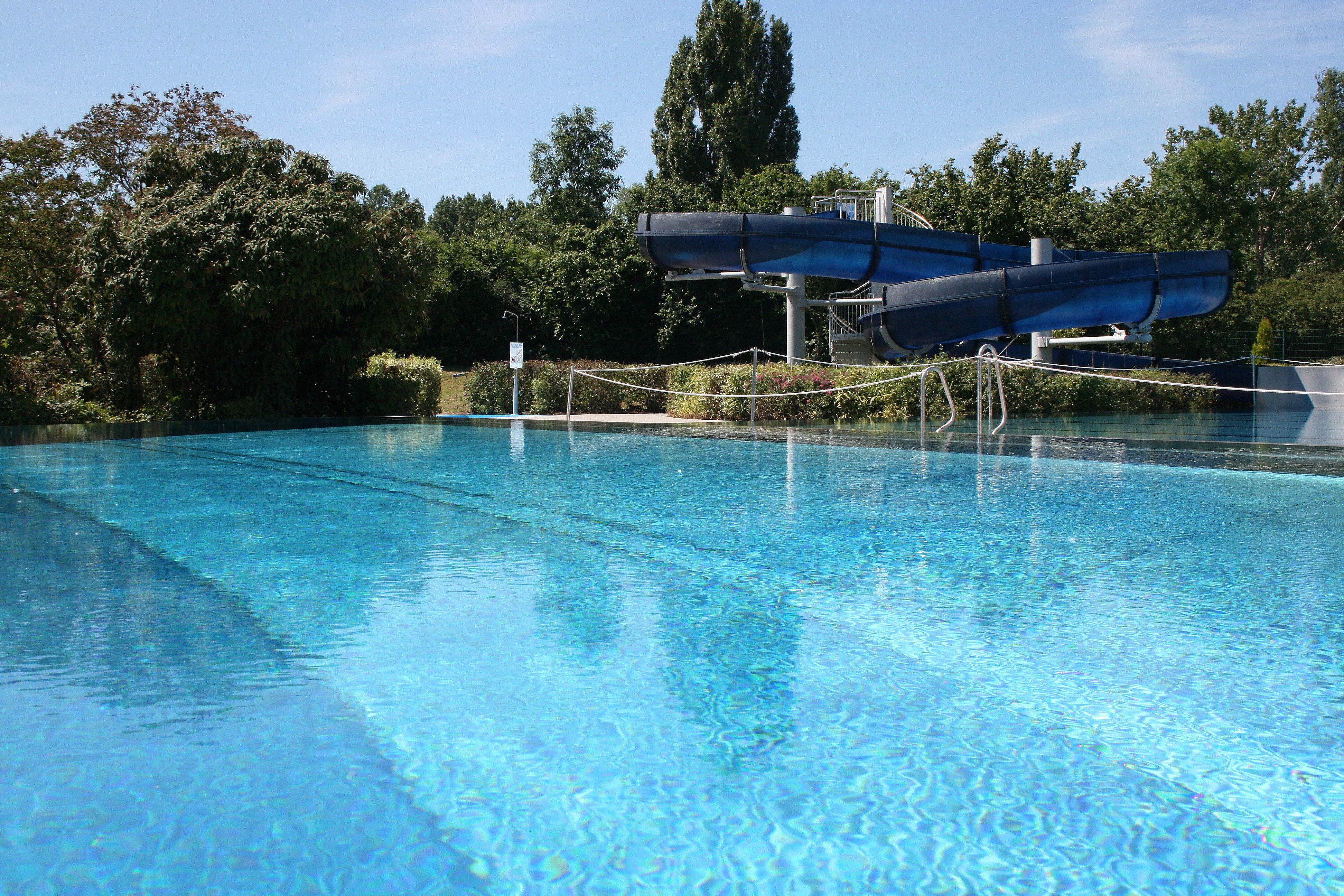 Das Sportbecken ist 21 auf 50 Meter groß und hat eine gleichbleibende Wassertiefe von 1.80 Meter. Im Randbereich gibt es eine 50 Meter lange Riesenrutsche.