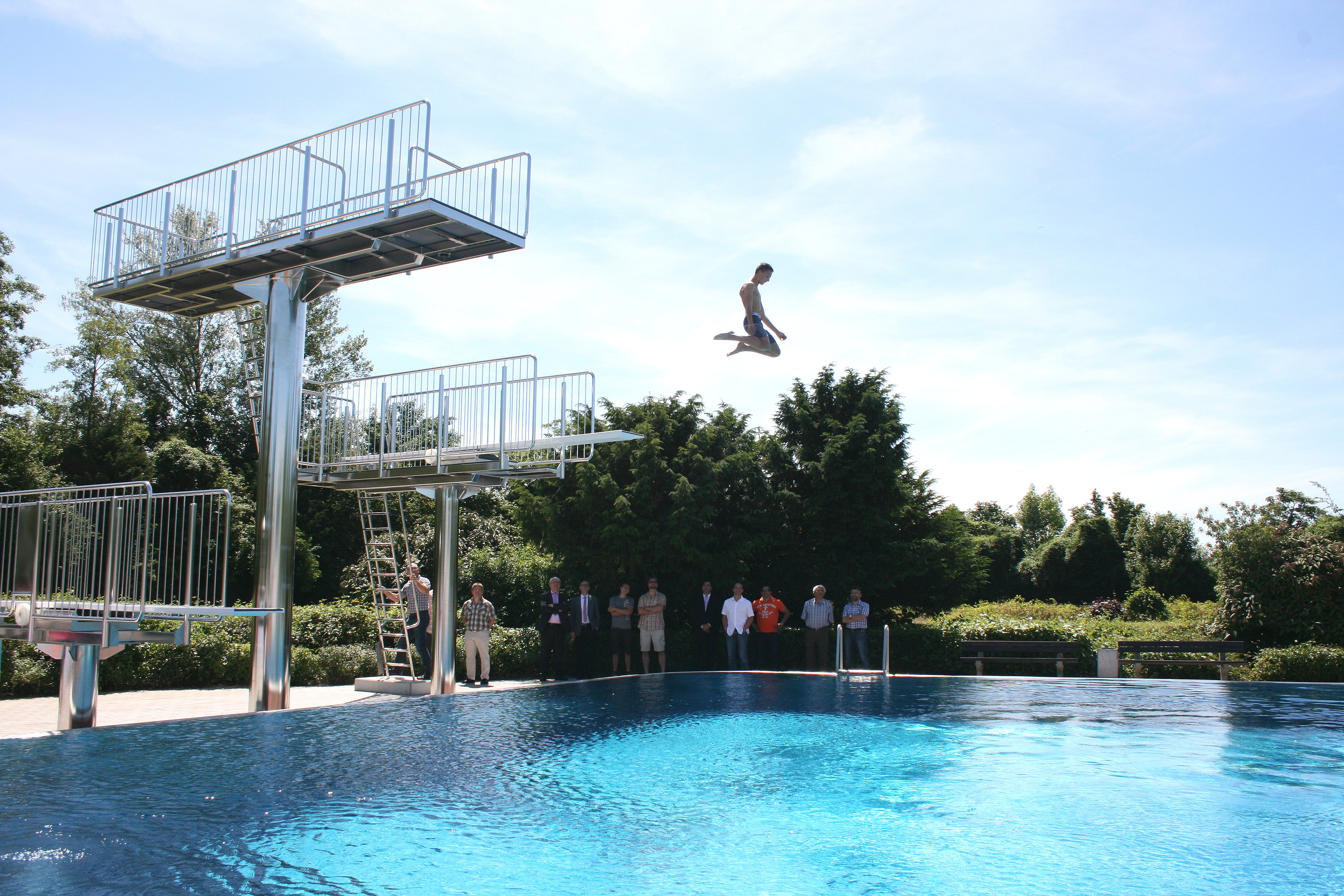 Das Springerbecken besitzt zwei Ein-Meter-Sprungbretter, ein Drei-Meter-Sprungbrett und eine Fünf-Meter-Plattform.