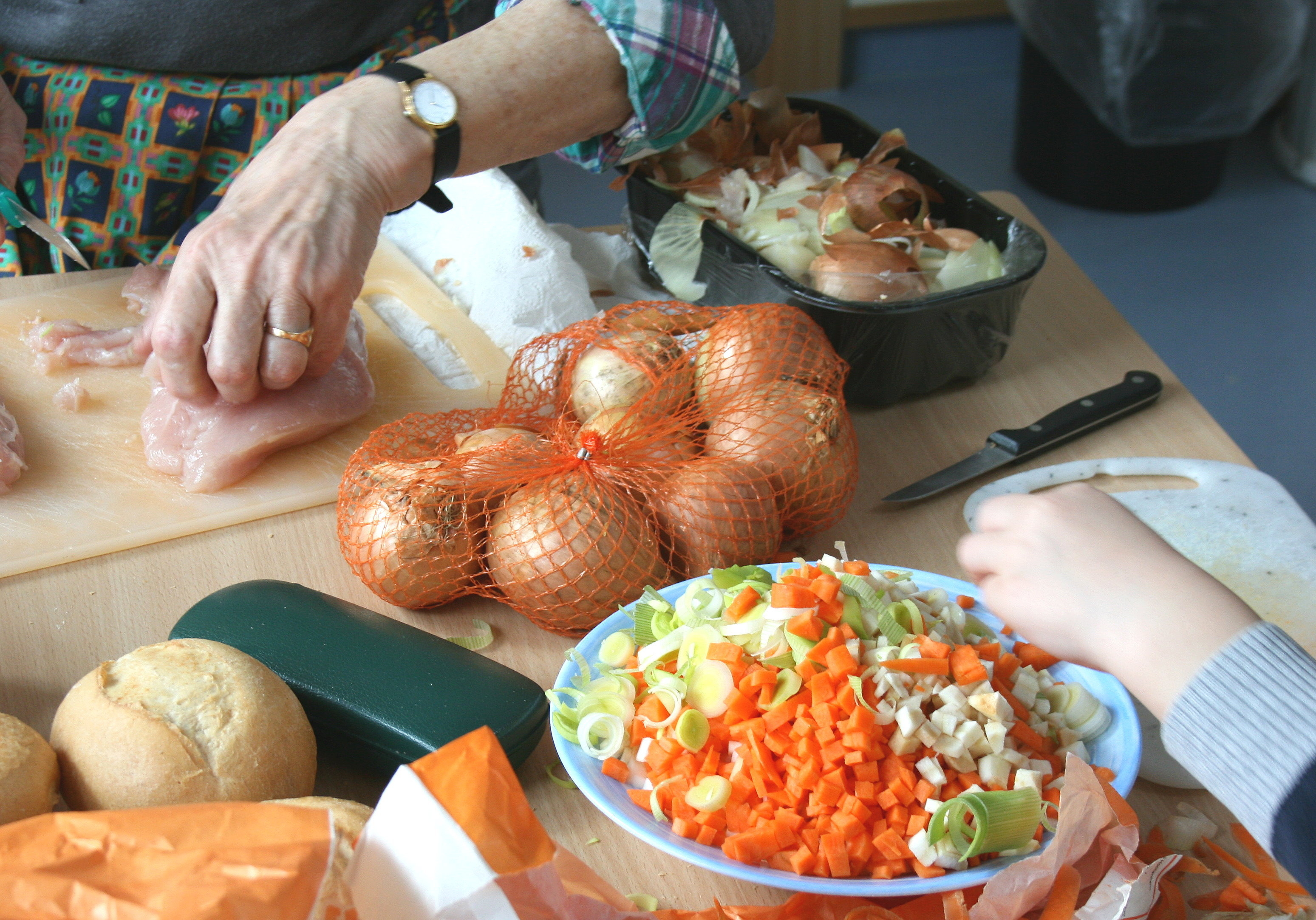 Schneiden, kneten, formen - und natürlich auch probieren! Die „Koch-Omis“ - eine Gruppe des Seniorenbeirats - sind regelmäßig bei Kindergarten-Vorschulgruppen zu Gast, um mit ihnen etwas Leckeres zuzubereiten und anschließend in geselliger Runde zu essen. Vieles wurde in den vergangenen Jahren bereits ausprobiert: Unter anderem standen Kartoffelsuppe, Erdbeerquark, Pfannkuchen und Weihnachtsplätzchen auf der Rezeptliste nach Hausfrauenart. Ob backen oder kochen - die Kinder waren immer begeistert!