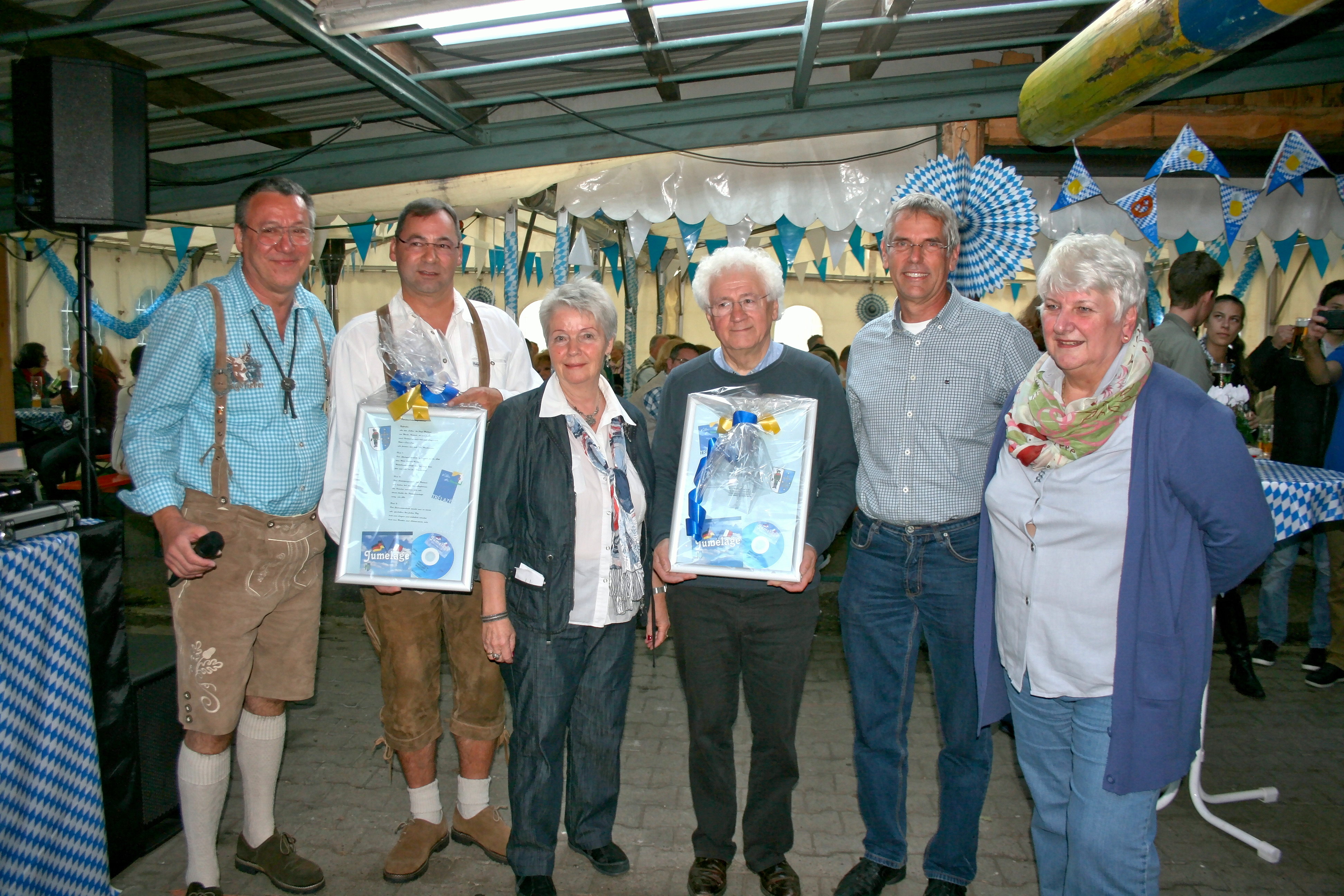Beim deutsch-französischen Oktoberfest sorgt Bernd Bürkle für eine große Überraschung, als er das selbst komponierte Partnerschaftslied singt und auf einer CD als Geschenk überreicht. sas