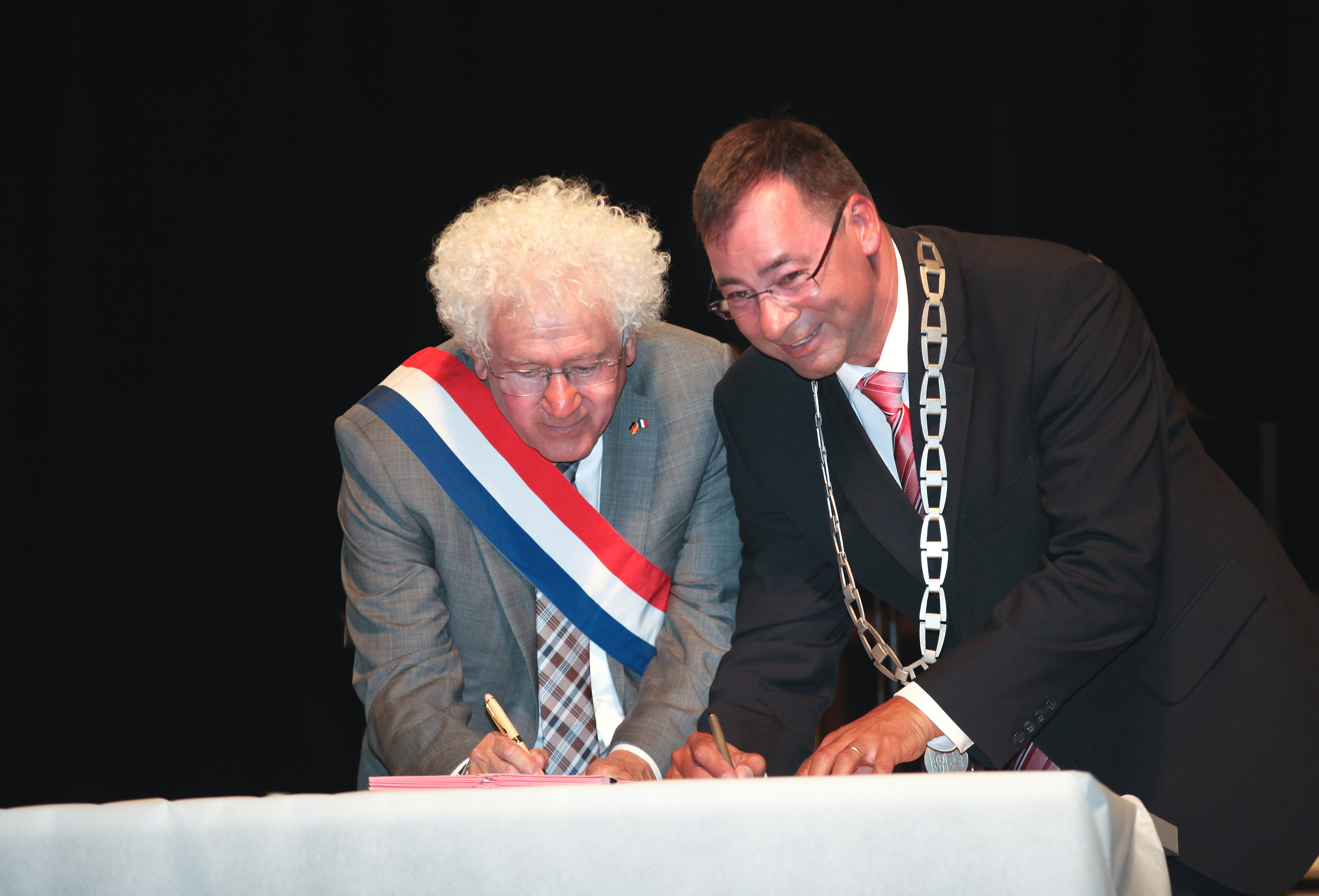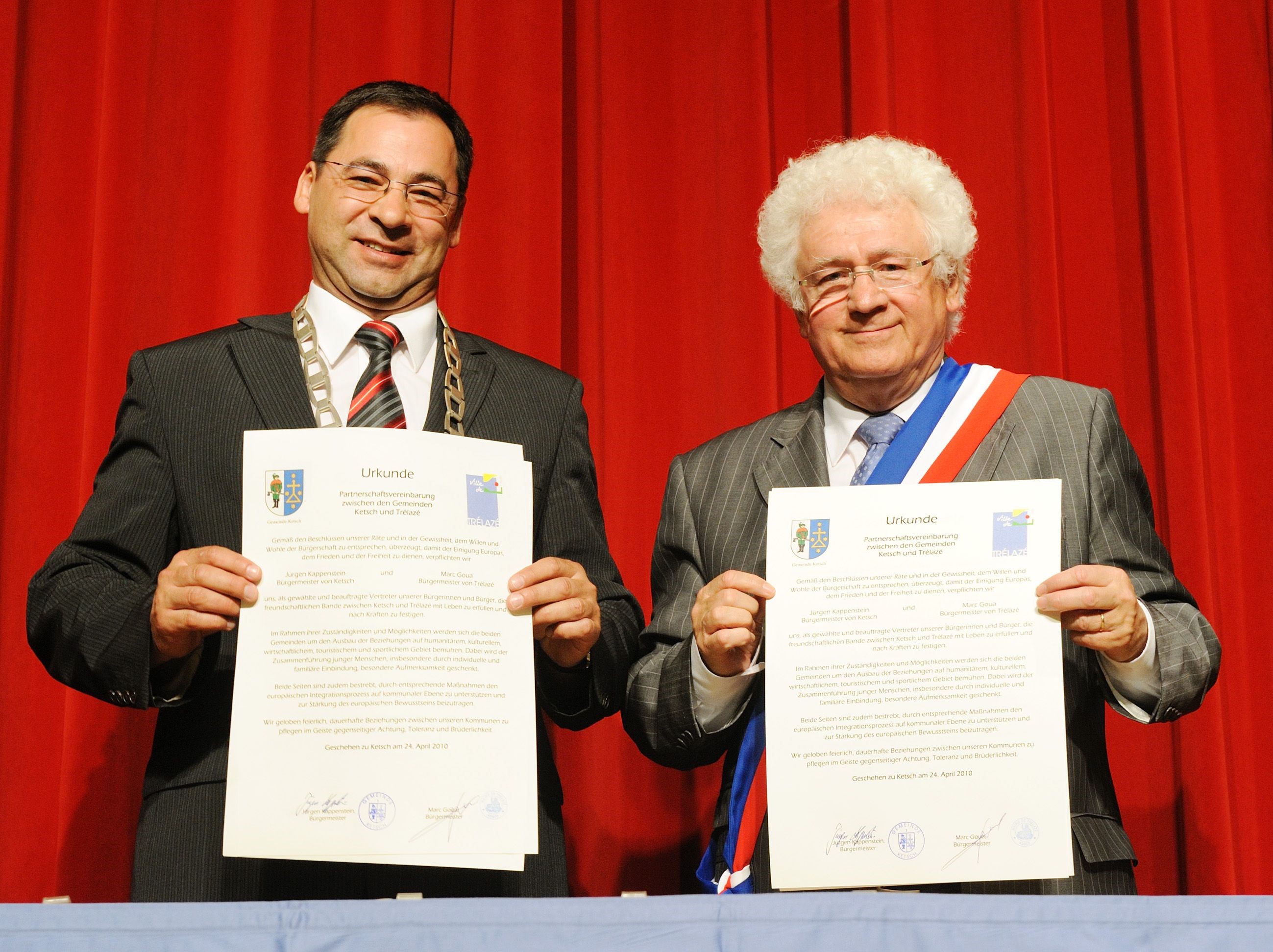 Es ist ein ganz besonderer Augenblick, als die Bürgermeister Jürgen Kappenstein und Marc Goua am 24. April in der Rheinhalle mit ihren Unterschriften die Partnerschaft besiegeln und die französische und die deutsche Nationalhymne erklingen. Beim anschließenden Festprogramm präsentieren Ketscher Vereine gelungene Bühnen-Darbietungen mit Musik, Sport, Gesang und Tanz. Wenige Stunden vorher ist ein Partnerschaftsbaum in der Grünanlage hinter dem Rathaus gepflanzt worden. Am nächsten Tag wird das Ortsschild mit dem Hinweis auf die Jumelage eingeweiht.